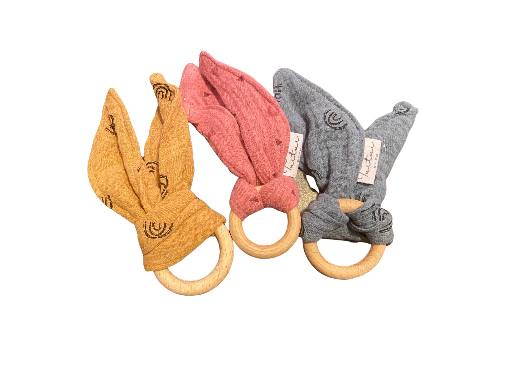 Our mini teethers are made from muslin and smooth untreated birch wooden rings.