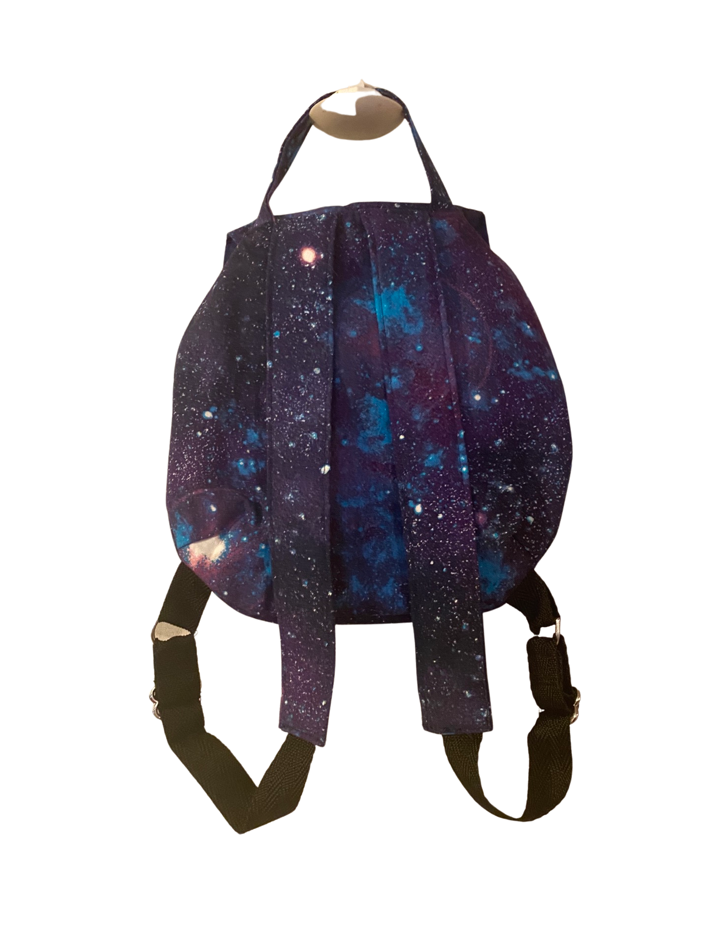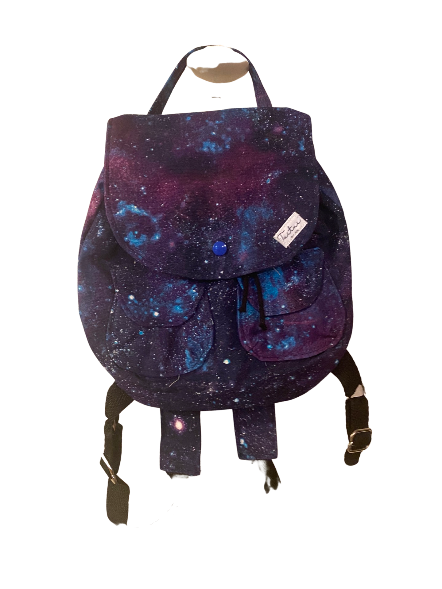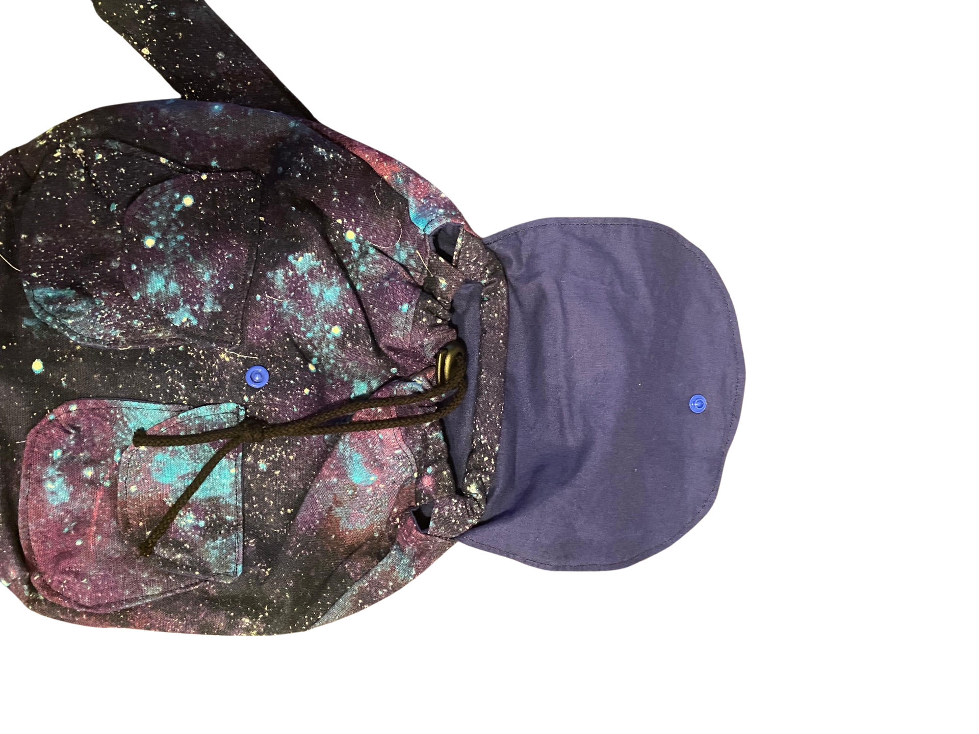 Materials: 100% cotton outer and lining, silver hardware, webbing, drawstring and plastic toggle