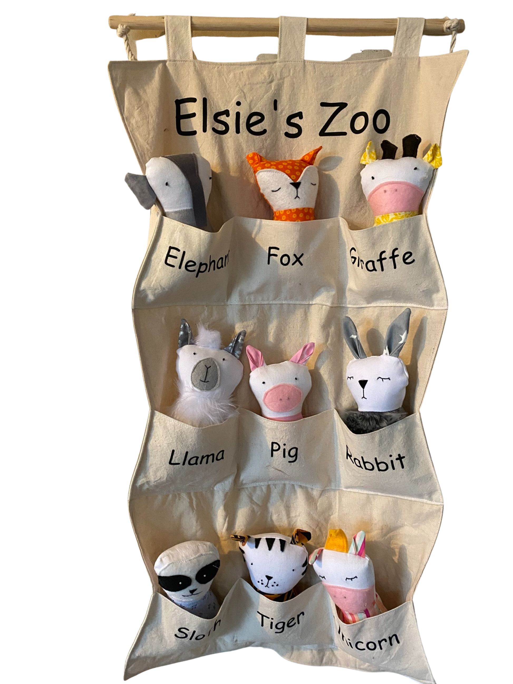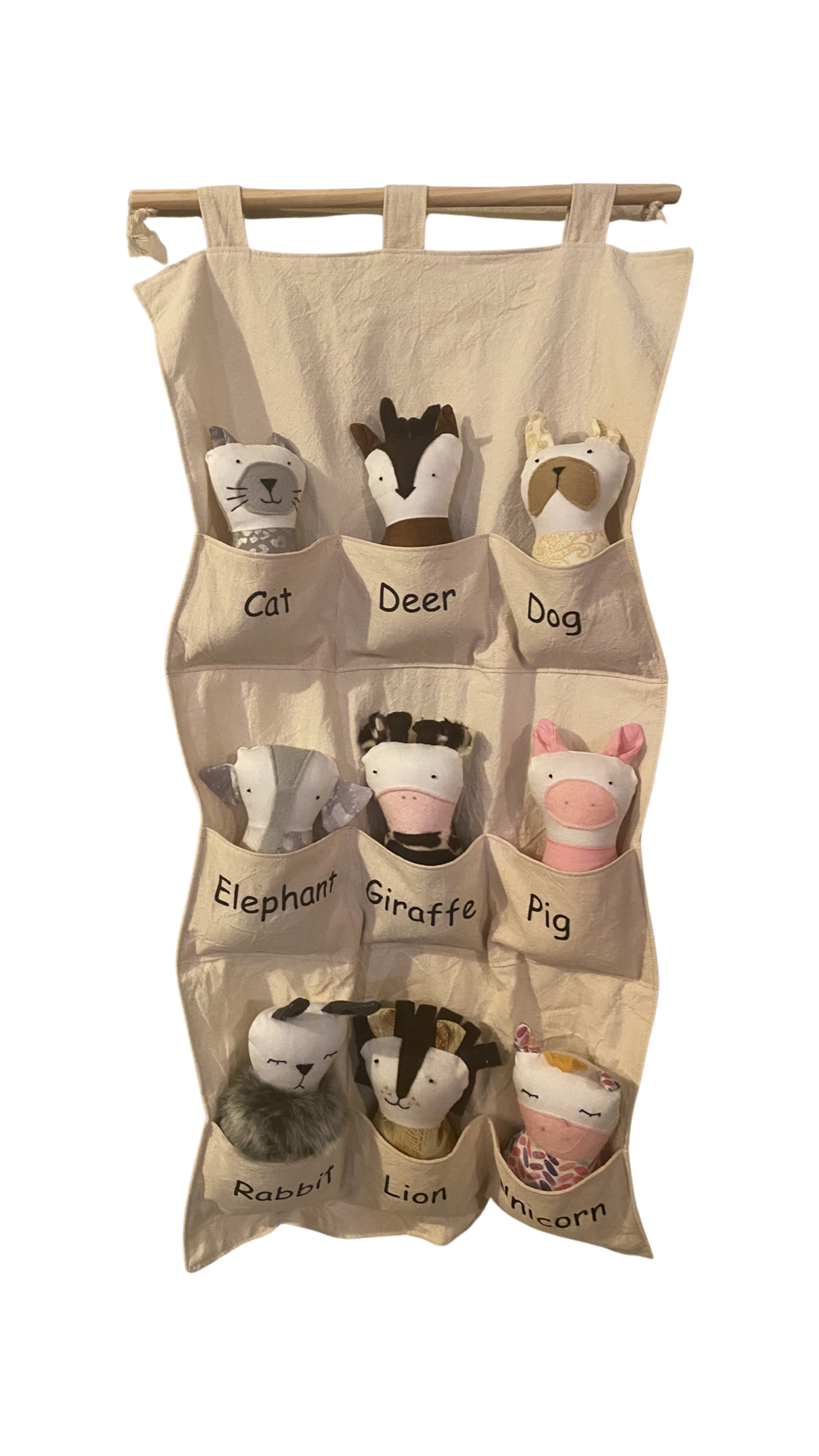 This pre-made zoo hanging has Cat, Deer, Dog, Elephant, Giraffe, Pig, Rabbit, Lion and Unicorn.