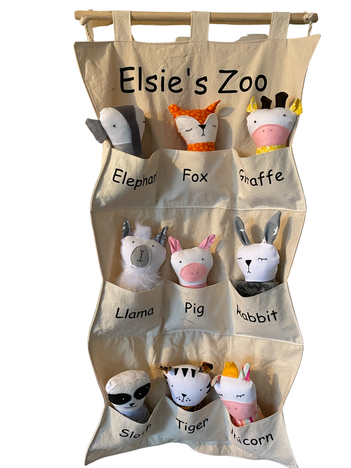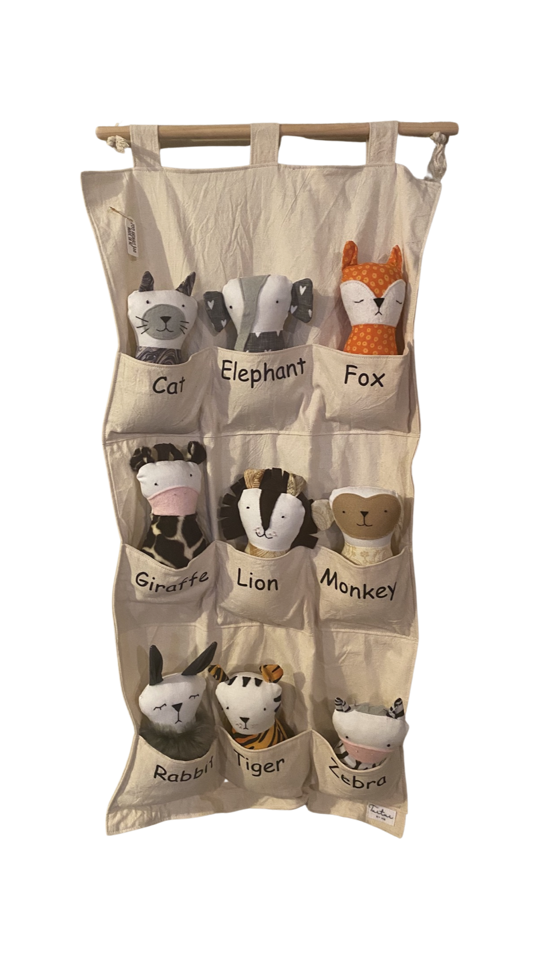 This pre-made zoo hanging has Cat, Elephant, Fox, Giraffe, Lion, Monkey, Rabbit, Tiger and Zebra.